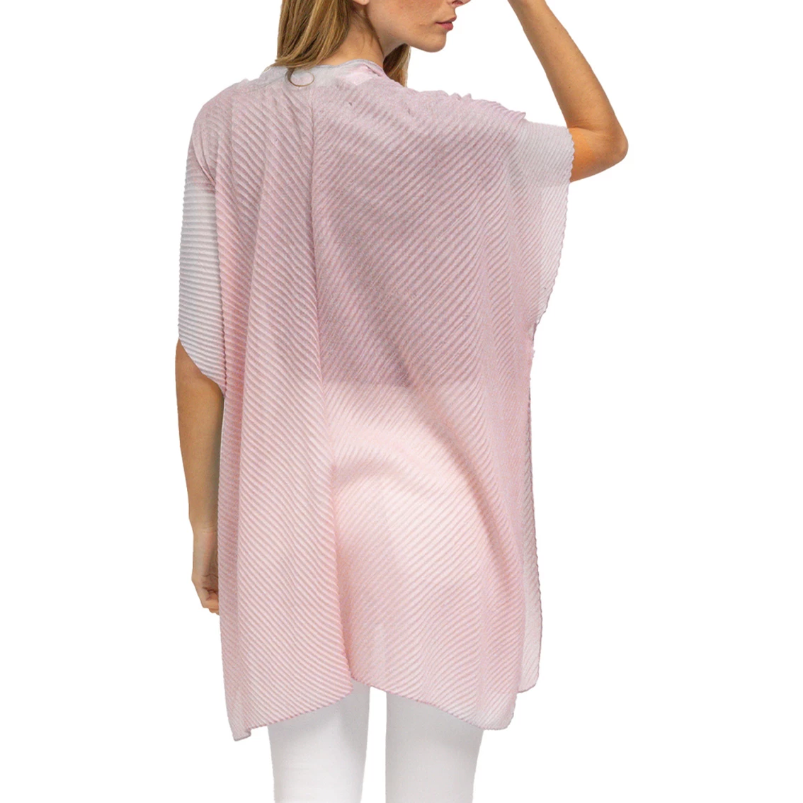 A fun seasonless solid pleated kimono. This topper features stylish colorways, easy to wear lightweight material. A perfect trendy layering piece. Style: AVK282S-BSH.