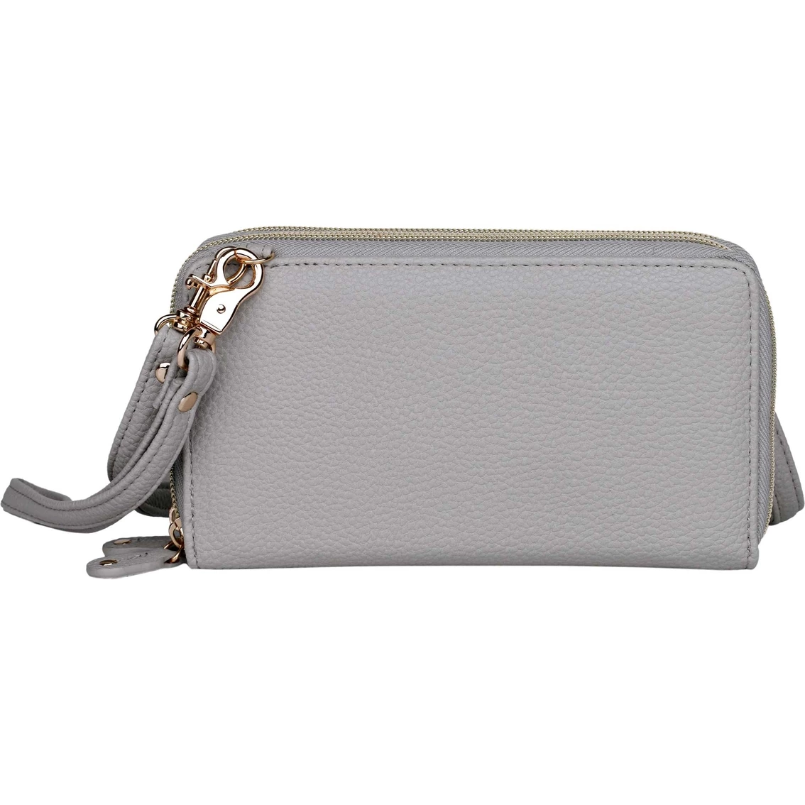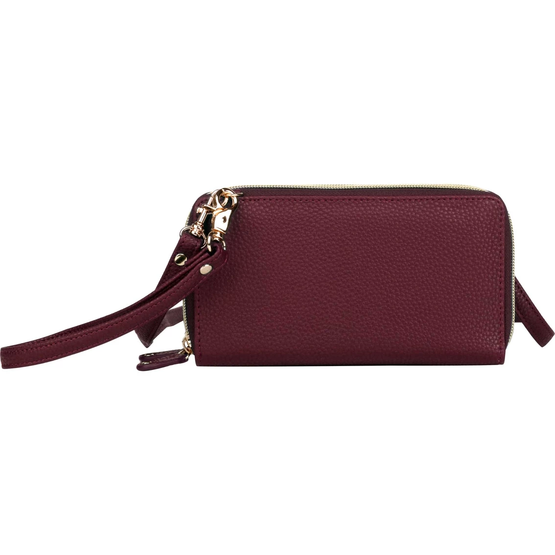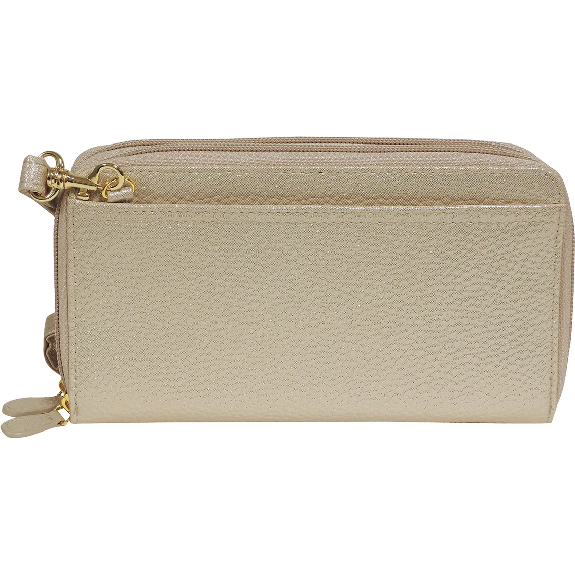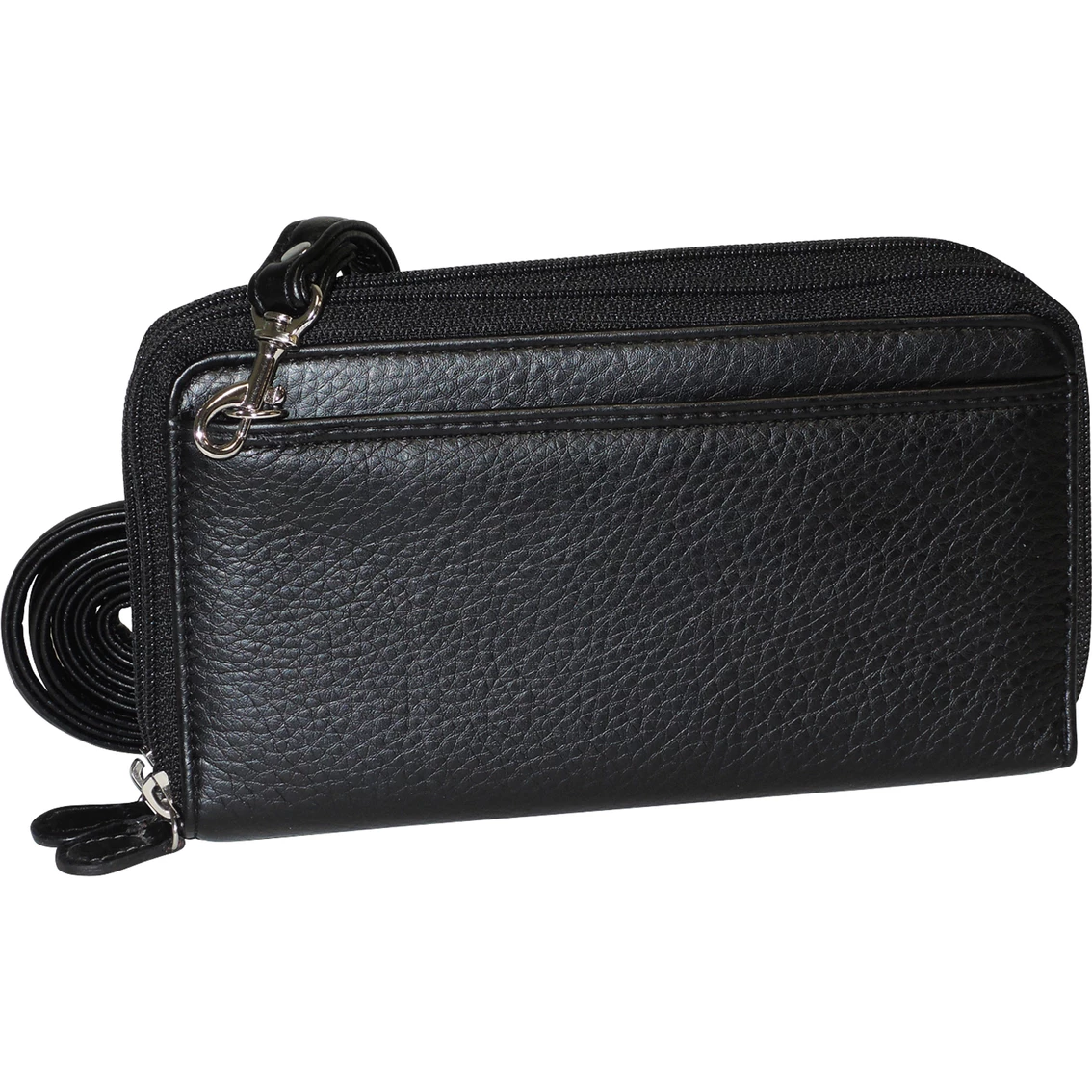 Made of a pebble grain PU with shiny nickel hardware, the Ultimate Organizer from Buxton features two full zip-around compartments and an outside slip pocket. The front compartment features multiple credit card slots and I.D. window, utility pockets, a removable checkbook with pen holder and an additional I.D. window. The second compartment features an interior zipper pocket, multiple credit card slots and a detachable shoulder strap. Style: 114W06.