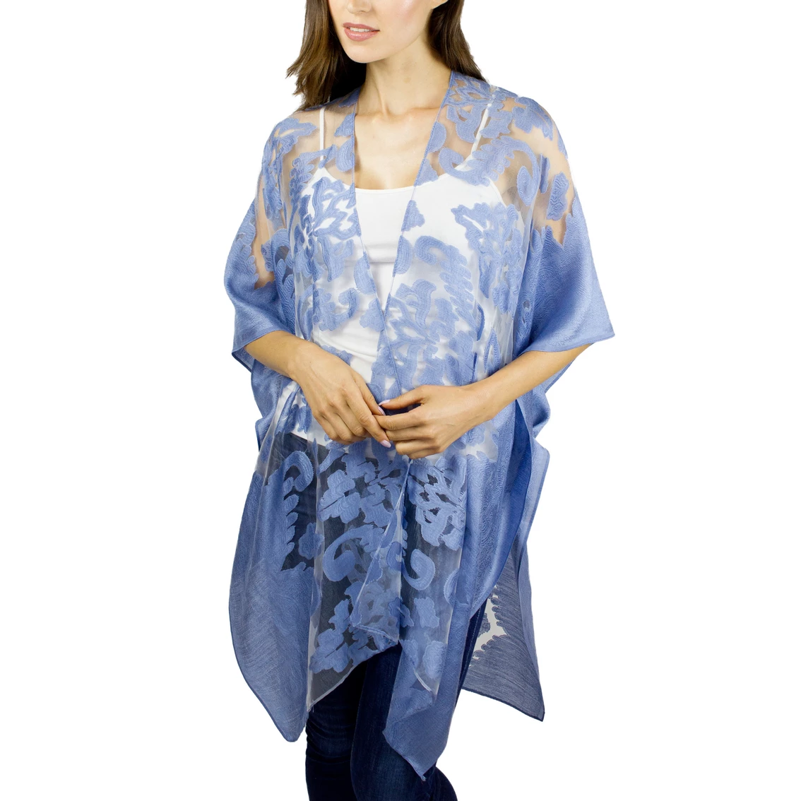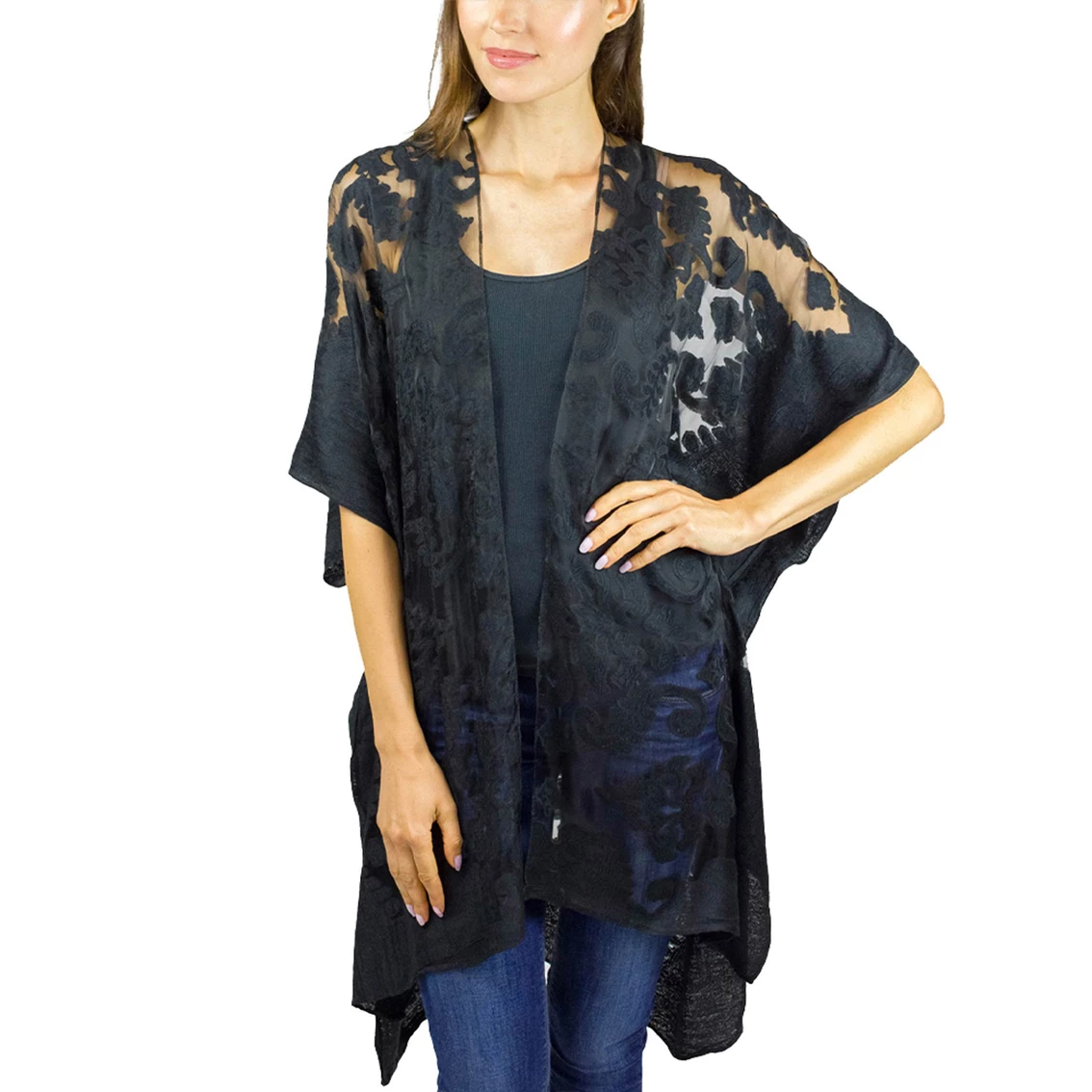 The Brocade Burnout Kimono from Just Jamie is a bold and beautiful layering piece. With season-less embroidered brocade print this topper features on trend colorways and easy to wear lightweight material. Style: KO17080JMS.
