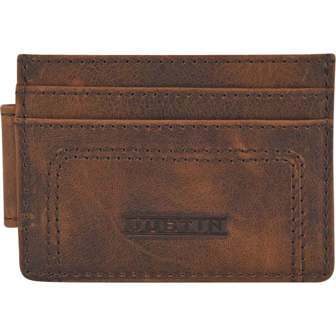 This Justin Card Wallet is made from brown pull up leather with stitched details. It features 2 credit card slots, 1 slip pocket and 1 magnetic currency clip. This wallet is just the right size to slip into your pocket. Style: 22125662M2.
