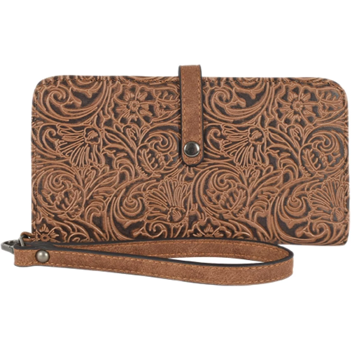 Keep things close by with the Justin Slim Wallet with wristlet. Made in a weathered brown with tooling pattern. It features credit card slots, 3 slip pockets, 1 zipper pockets and a snap closure. Style: 22110775W.