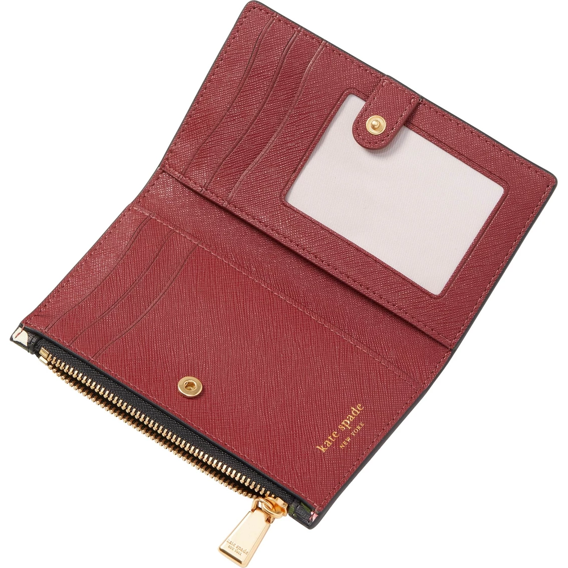 Stop and smell the roses. This Kate Spade New York Morgan Small Slim Bifold Wallet is in full bloom! Made of printed textured PVC, the wallet secures with a snap closure. It features eight credit card slots, two slip pockets, an interior zip pocket and a pinmount logo. The wallet measures 3.25 in. H x 5.5 in. W x 0.5 in. D. Style: K9240001.
