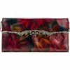 The Mundi File Master is a multi-functional clutch wallet with a center o’ ring overlay on the front flap and a zipper pocket on the back. Inside there are 2 ID windows under the flap; thumb hole ejectors in ID windows; 3 gusseted pockets; back gusset has “coupons” label; middle gusset has “receipts” label; front gusset has “cash” label; zipper pocket gusset divider between back and middle gussets; front credit card tab section has 6 top entry credit card slots; 1 bottom entry slip pocket; 6 left entry credit card slots. Style: 33642514.