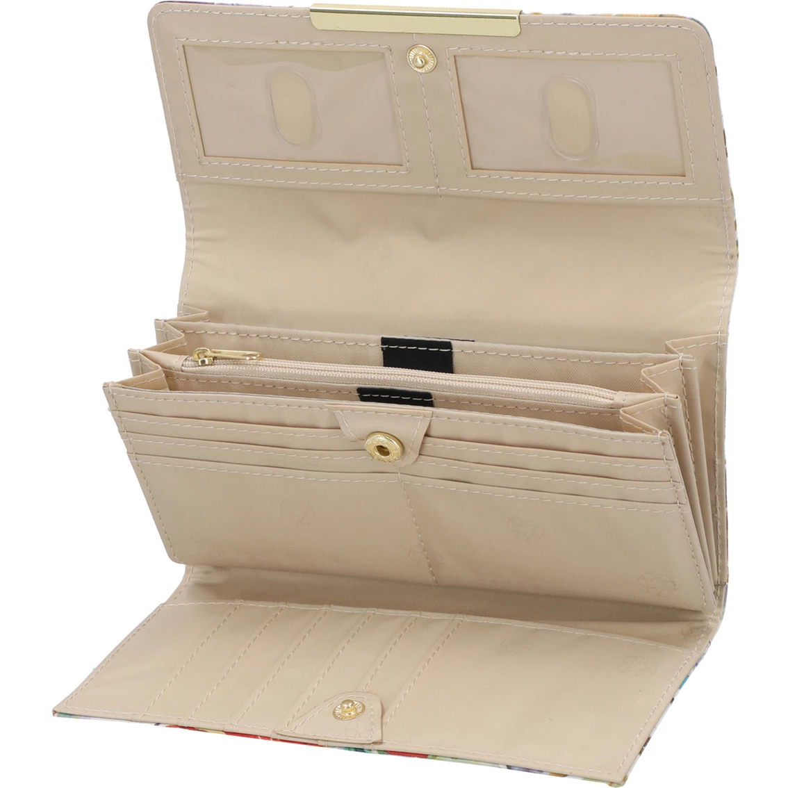 The Mundi File Master is a multi-functional clutch wallet with metal bar detailing on the front flap and a zipper pocket on the back. Inside there are 2 ID windows under the flap, thumb hole ejectors in ID windows, 3 gusseted pockets, back gusset has ‘coupons’ label, middle gusset has ‘receipts’ label, front gusset has ‘cash’ label, zipper pocket gussest divider between back and middle gussets, front credit card tab section has 6 top entry credit card slots, 1 bottom entry slip pocket and 6 left entry credit card slots. Model: LH965862.