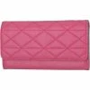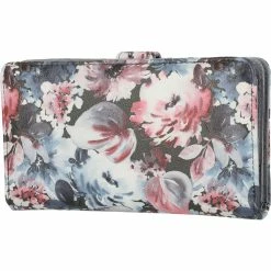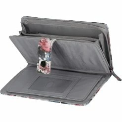 The Mundi Madame Secretary clutch is a sleek wallet with a metal snap tab closure, a back ‘L’ zipper pocket, and ample storage space inside. The front wall has 8 credit card slots and one top entry slip pocket behind the credit card slots, a removeable checkbook cover, and there is a center divider zipper pocket with a metal puller. The interior has two large clear PVC windows on either side and the back wall features 8 credit card slots and a bottom entry slip pocket behind the credit card slots. Style: LN223562.