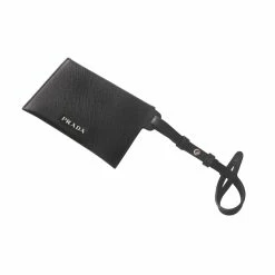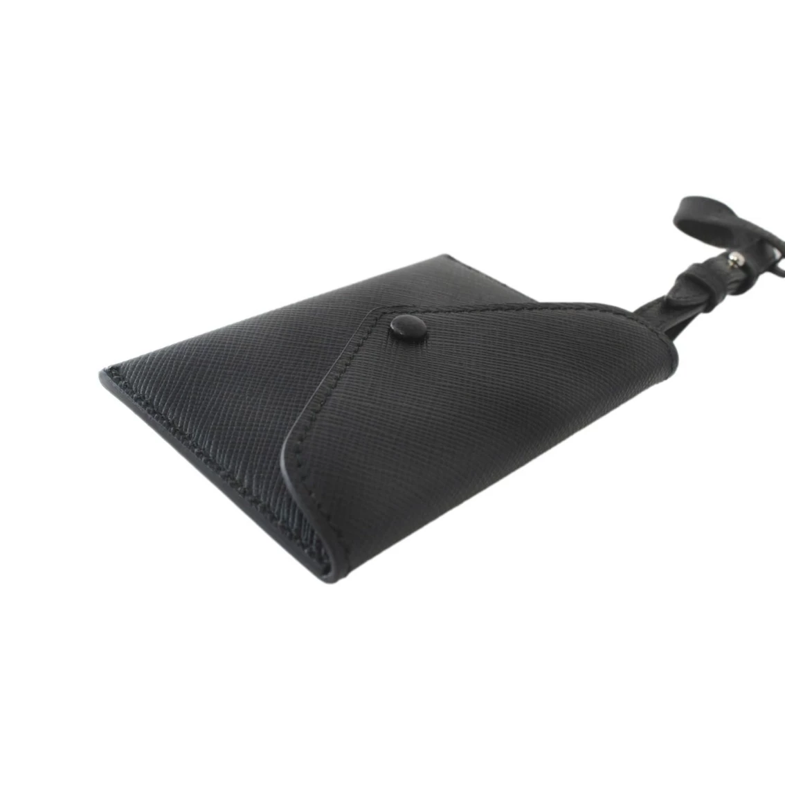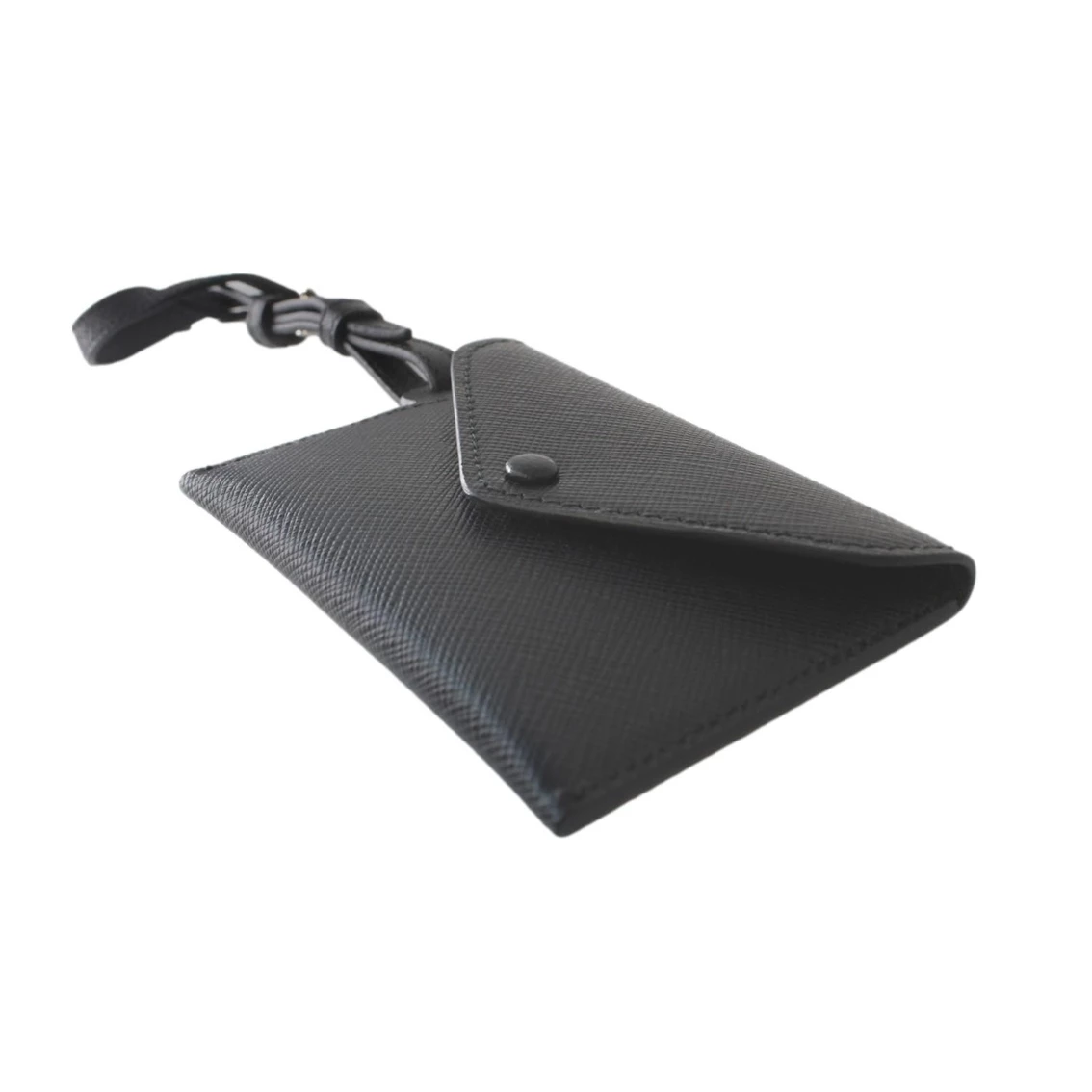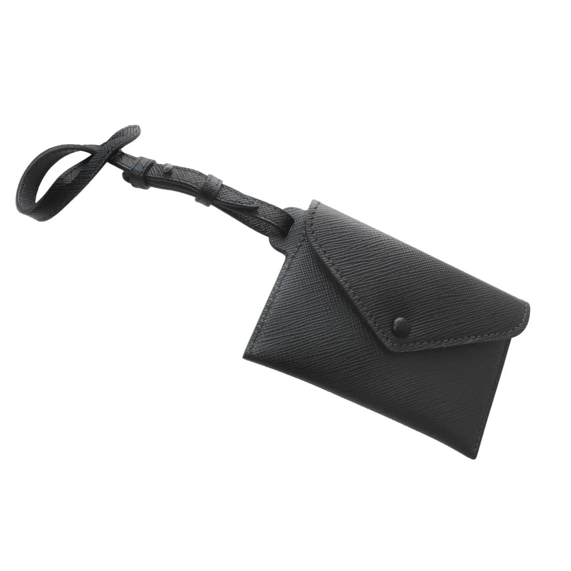 This sophisticated luggage tag from Prada is crafted with a black saffiano leather. It features an envelope flap with snap closure and Prada logo on back. This versatile piece can be used as a luggage tag, keychain, or card case. Travel in style with this fun accessory!