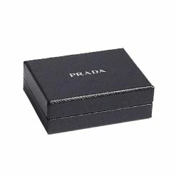 This unisex keychain from Prada is crafted of a dark burgundy red enamel atop a silver-tone rectangular base. The key ring can easily be attached toΒ keys or a bag for an added luxurious flare.Β