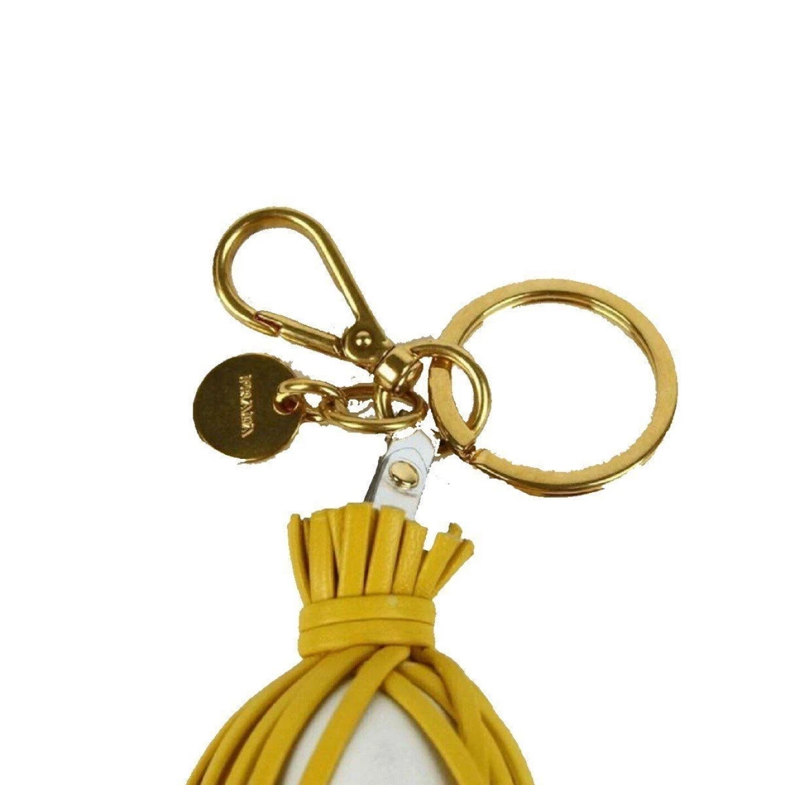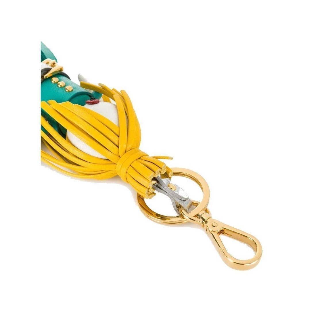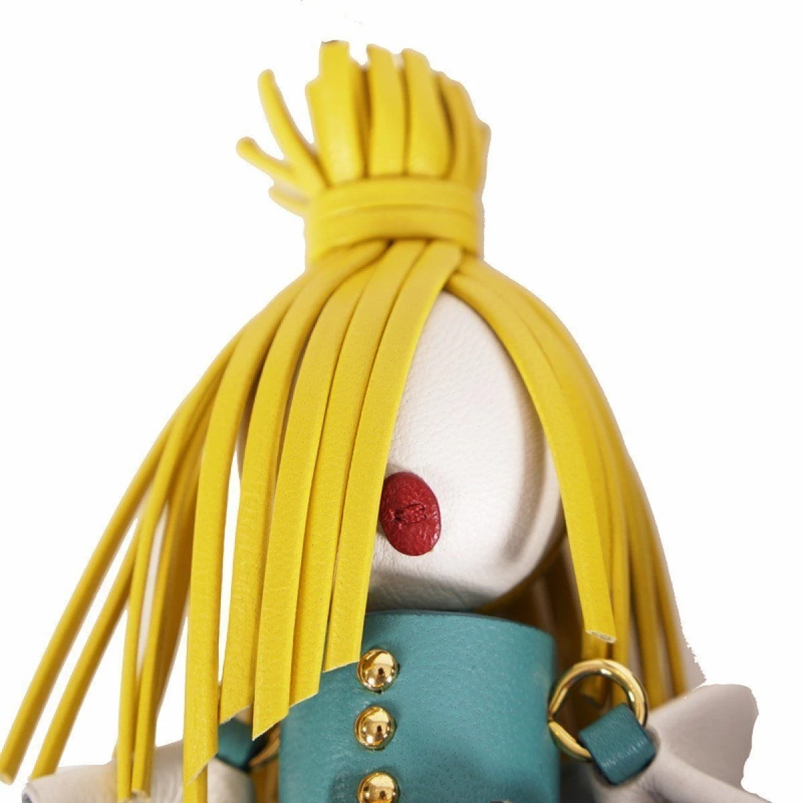 This Prada Alice doll key chain is absolutely adorable. This Prada charm is the perfect accessory for your designer handbag. The teal and yellow leather looks so cute together. This Prada key chain is so unique and different. Perfect for adding a pop of color to your bag! Includes authenticity cards and Prada box.