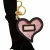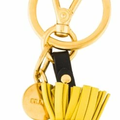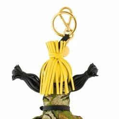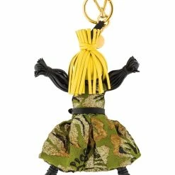 Prada’s leather Jasmine key ring featuring green brocade fabric dress with black leather belt. A lobster clasp closure, spring-ring fastening, gold-tone hardware and an engraved logo charm makes this the perfect accessory for your bag or keys.