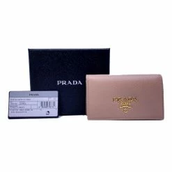 This Prada card case wallet features beautiful neutral leather that makes it the perfect accessory for anybody. The Prada Paris logo featured on the front is eye-catching. Its large interior and two slip pockets mean organizing is a breeze. You’ll never want to leave home without this sophisticated wallet. Includes authenticity cards and Prada box.Β
