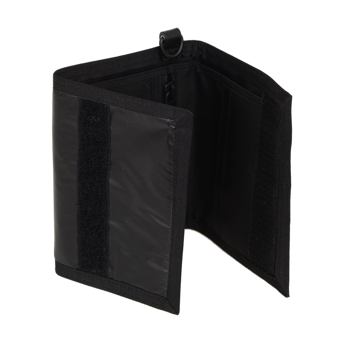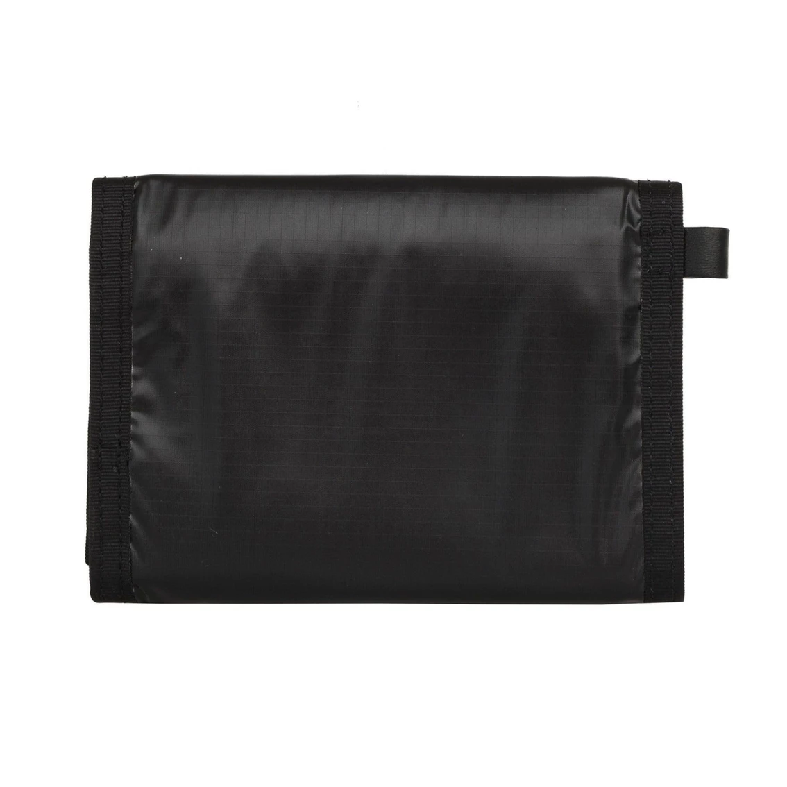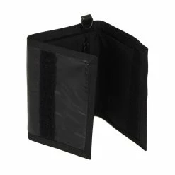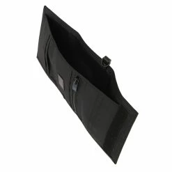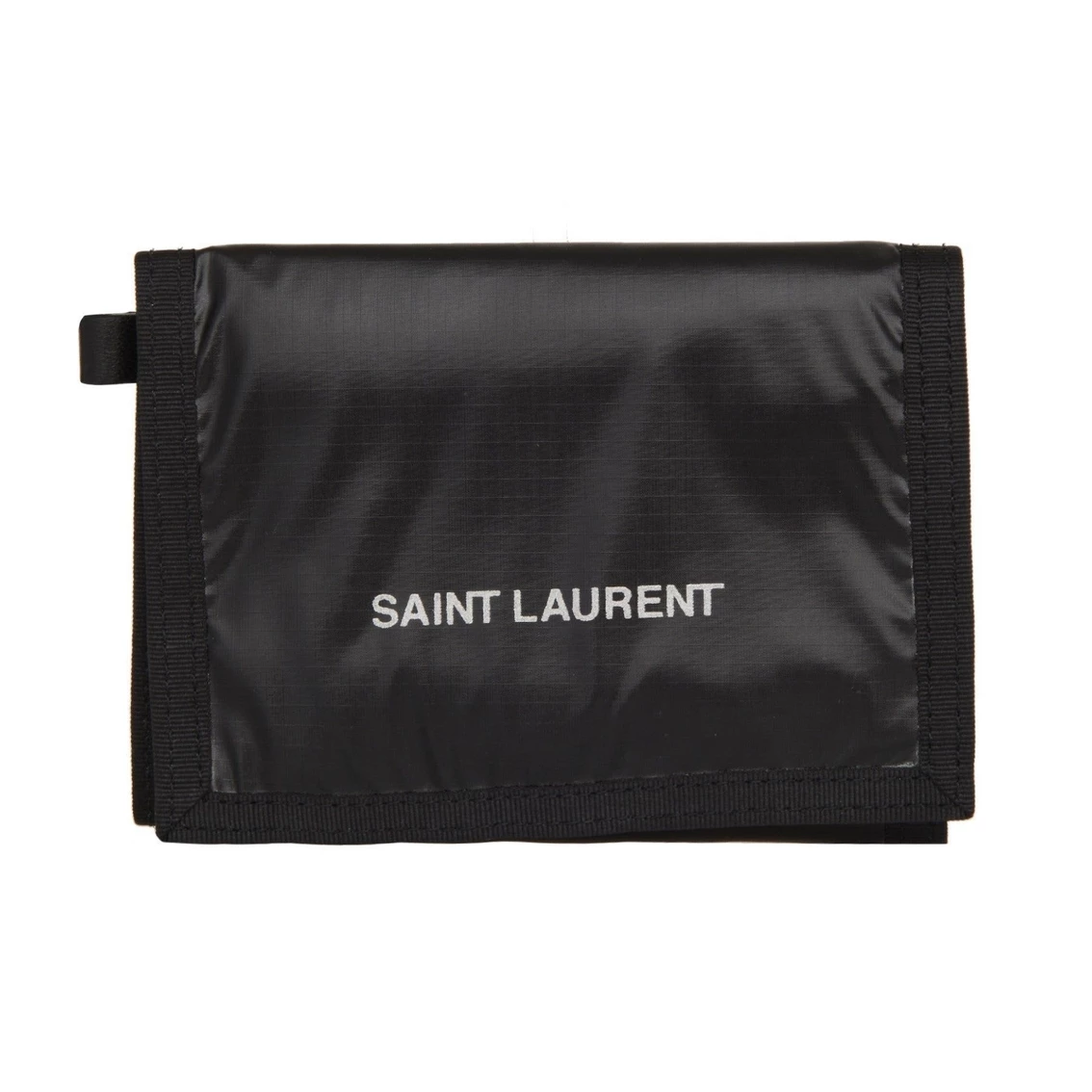 This Saint Laurent trifold wallet in black coated nylon. The front of this wallet features Saint Laurent logo in white, and is trimmed in black nylon. Velcro closure flap opens to five card slots, one zippered coin pocket, and one long bill slot. This slim and sleek trifold is perfect for everyday use, and will hold all of your daily essentials.